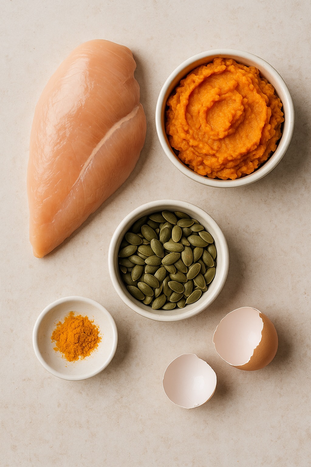 But here's what I learned: Pablo's gut needed more than just one ingredient. He needed support to actually heal, not just survive. So I kept going with that same grandmother rule. Australian chicken breast for lean, highly digestible protein. Sweet potato for the resistant starch his gut bacteria craved. Pumpkin seeds for the minerals processed treats had depleted. Eggshell powder to balance the dangerous calcium ratios in meat-only treats. Turmeric for the inflammation those "premium" brands had caused.
